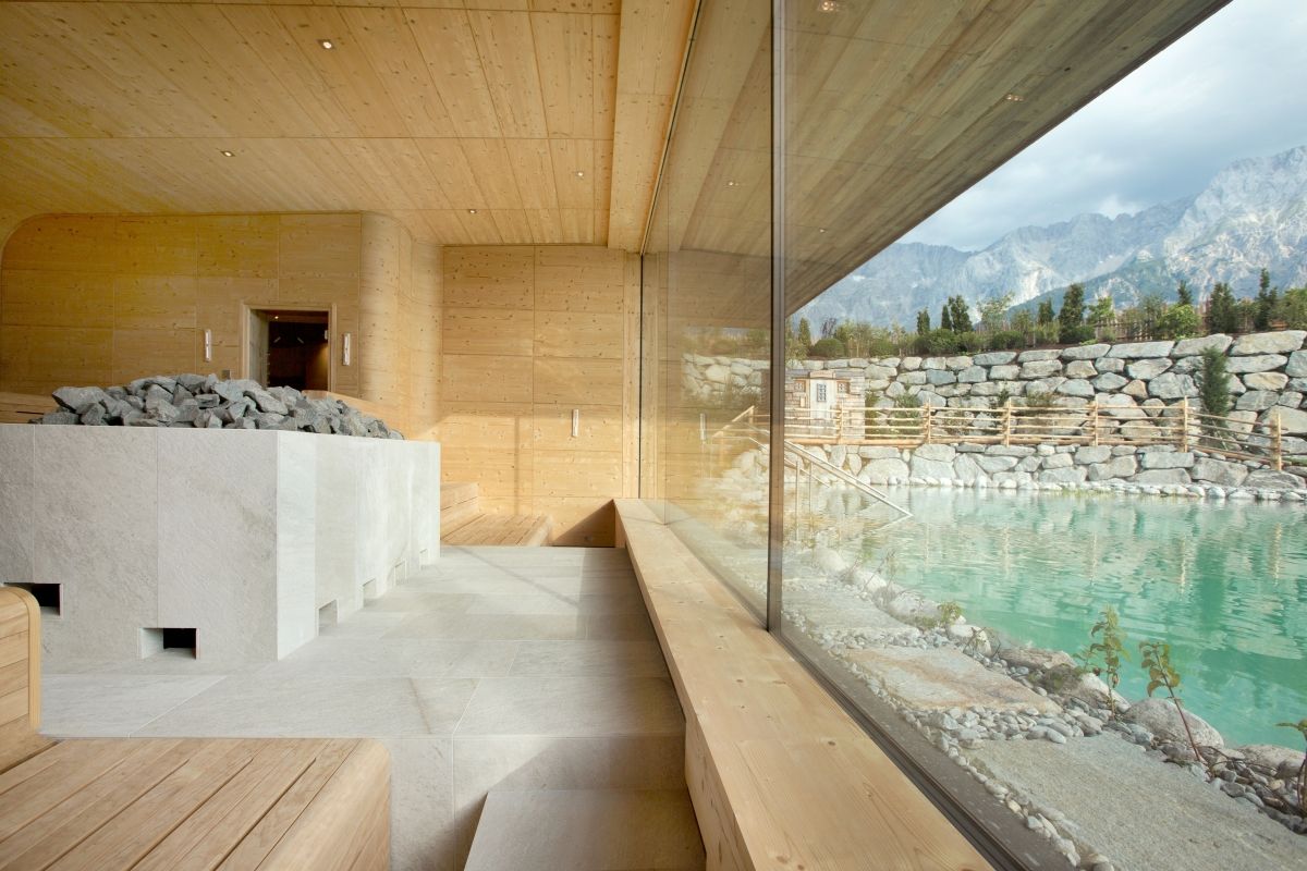 Zugang zum Saunadorf mit zahlreichen Saunen, warmem Pool und Bergsee