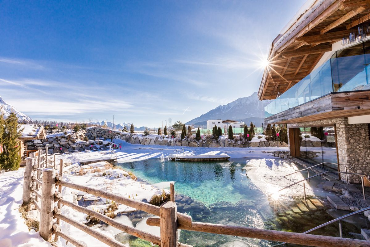 Zugang zum Saunadorf mit zahlreichen Saunen, warmem Pool und Bergsee