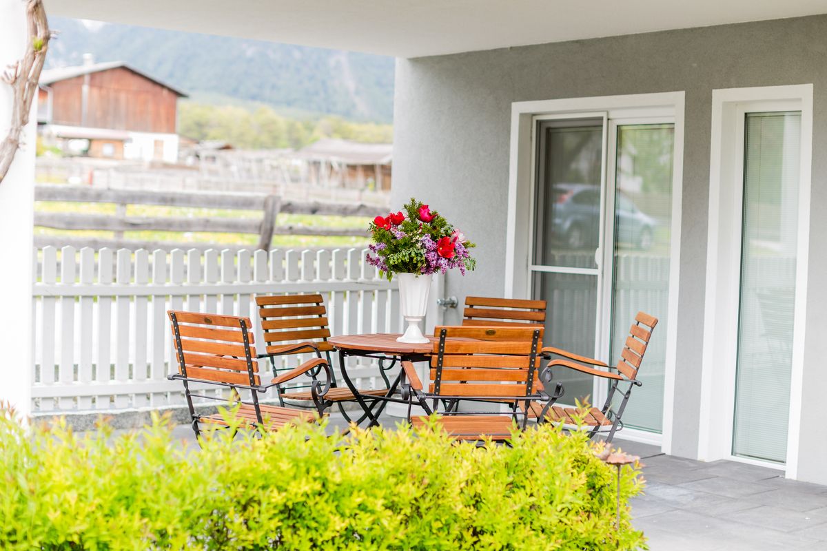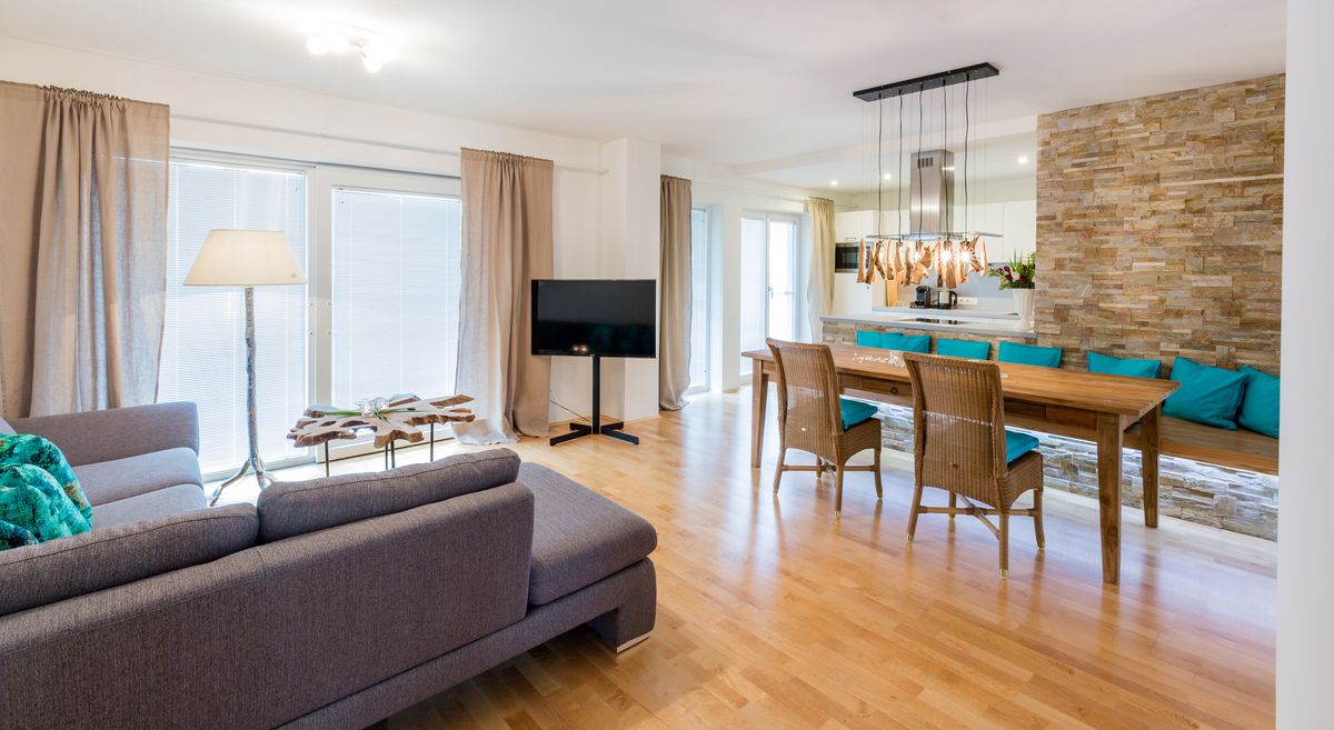 Exklusiv ausgestattetes Urlaubsappartement für 2 – 4 Personen, 91 m², nur 70 Meter vom Hotel entfernt, großzügiger Wohnraum, mit Couch und Essbereich, 2 Doppelzimmer mit Terrassenzugang, 100 m² Gartenbereich mit exklusiven Gartenmöbeln und überdachter Terrasse, Küche