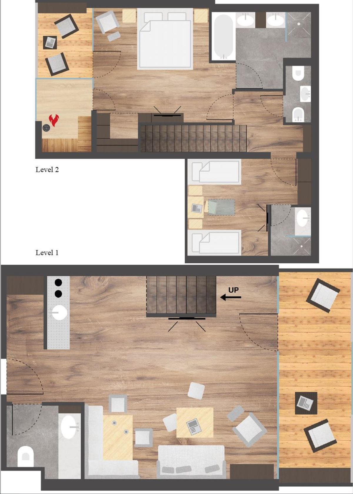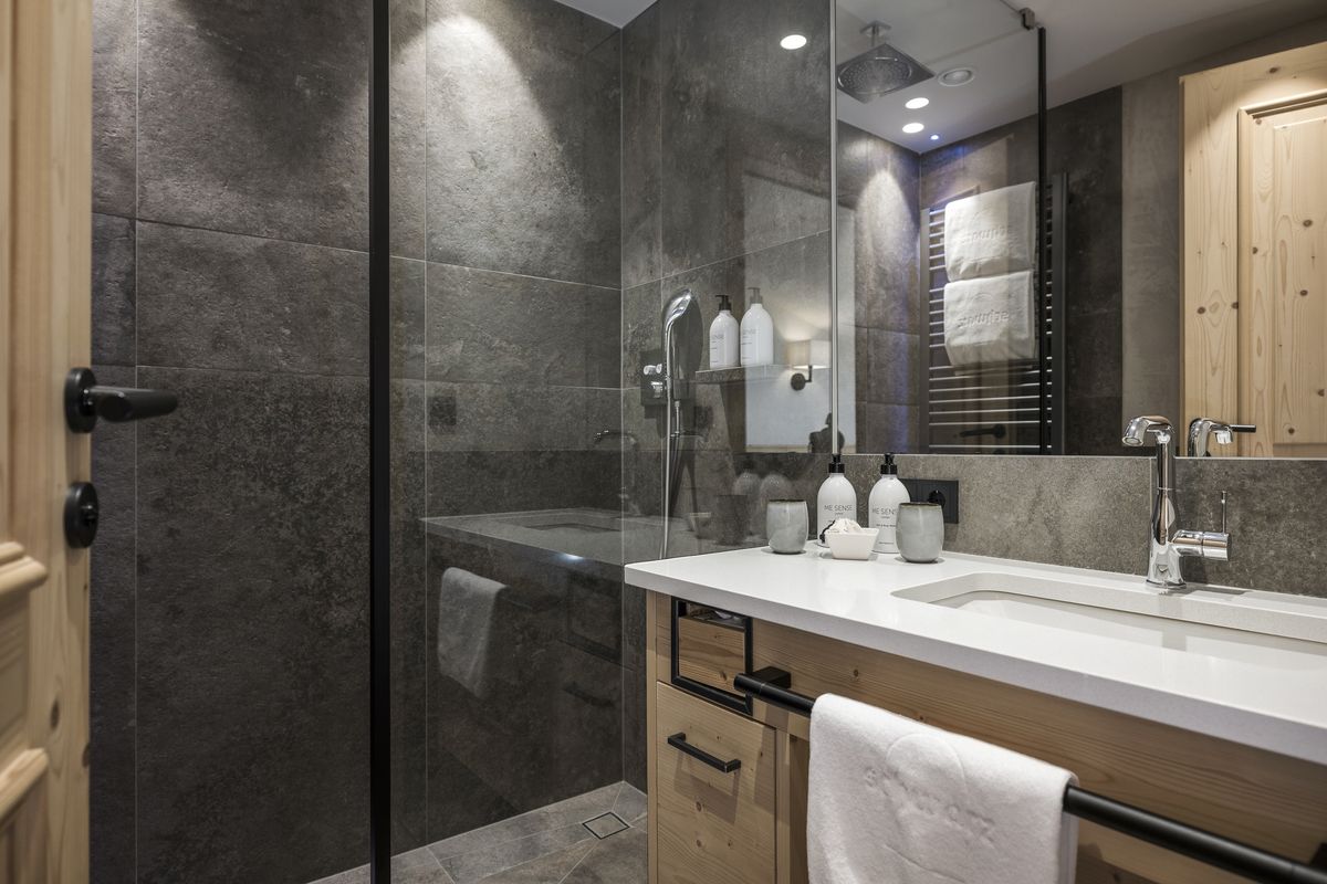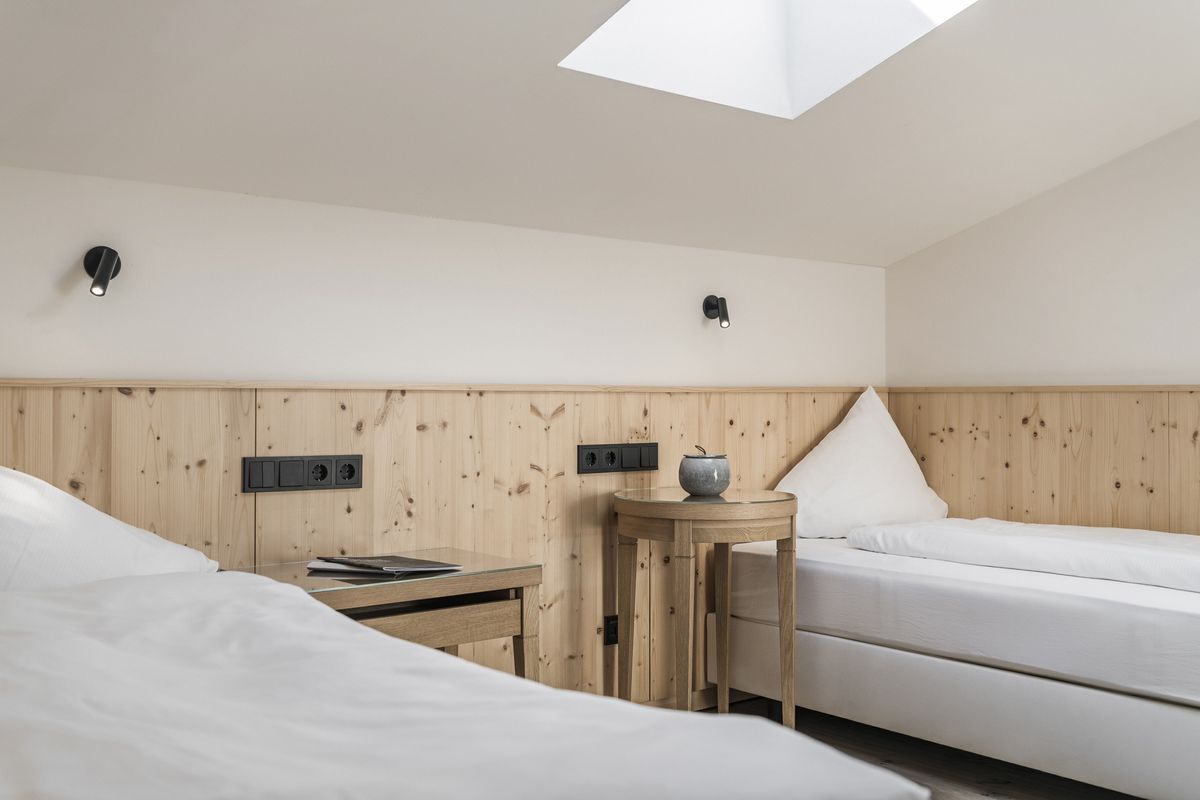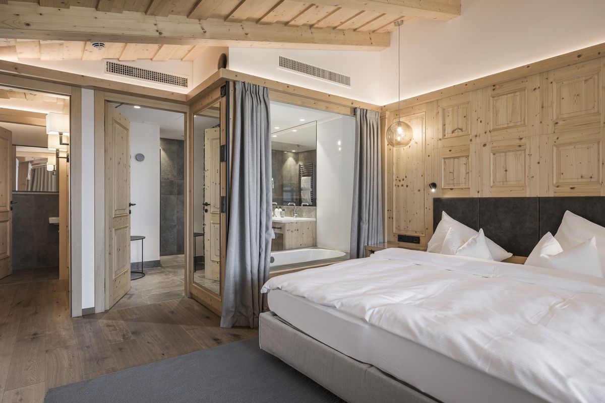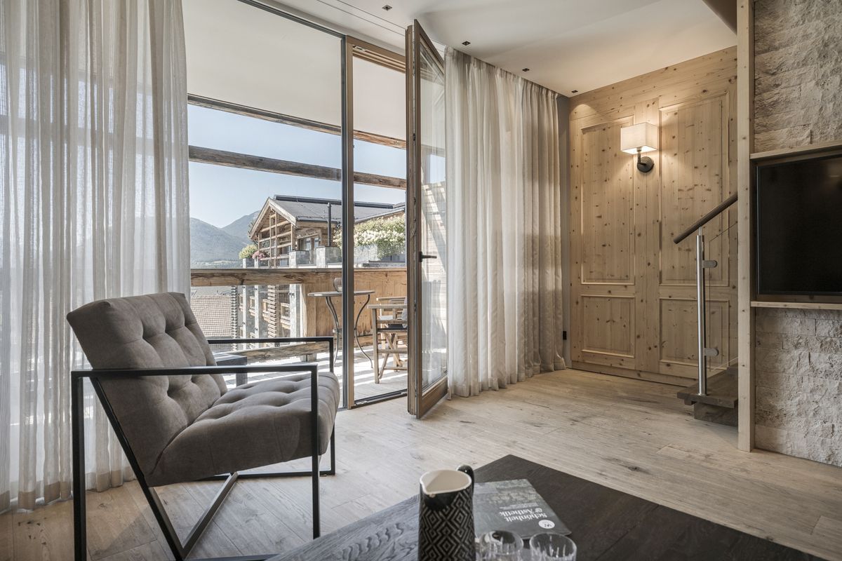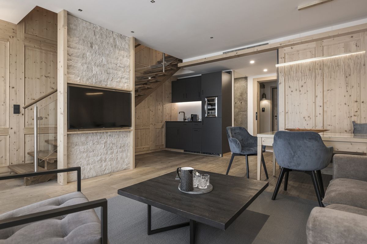 Im Stammhaus - 4. Stock, ca. 102 m², luxuriöse Dachsuite, klimatisiert, Holzboden, Wohnzimmer, großzügige Lounge-Küche, Weinschrank, Wohn- und Essecke, Lounge-Balkon, Bad mit Dusche, Waschtisch, WC. Stiege zu Maisonetten-Schlafzimmer mit King Size Doppelbett, Schrankraum, Balkon. Großes Badezimmer mit Badewanne, Dusche, Doppel-Waschtisch, WC separat mit Bidet. Zusätzlich Kinderzimmer, 2 Betten, Schreibtisch TV-Radio, Badezimmer mit Dusche, Waschtisch, WC. Panorama-Sauna mit Infrarotliegen.