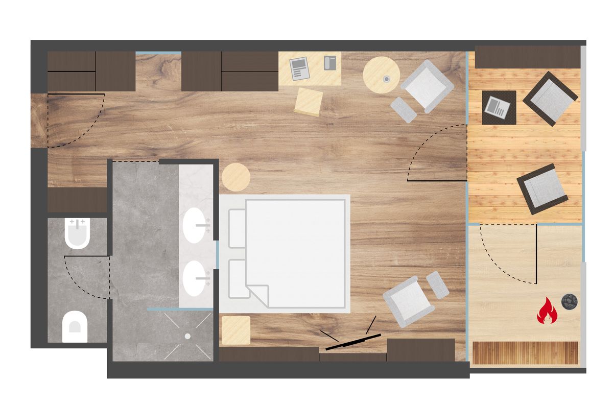 Modern ausgestattetes helles Doppelzimmer, elegantes Design, hochwertiger Holzboden, Klimaanlage, großer Balkon mit Ruheliege. Kingsize Doppelbett und Sitzecke. Badezimmer mit Dusche, Doppel-Waschtisch, WC separat mit Bidet.
