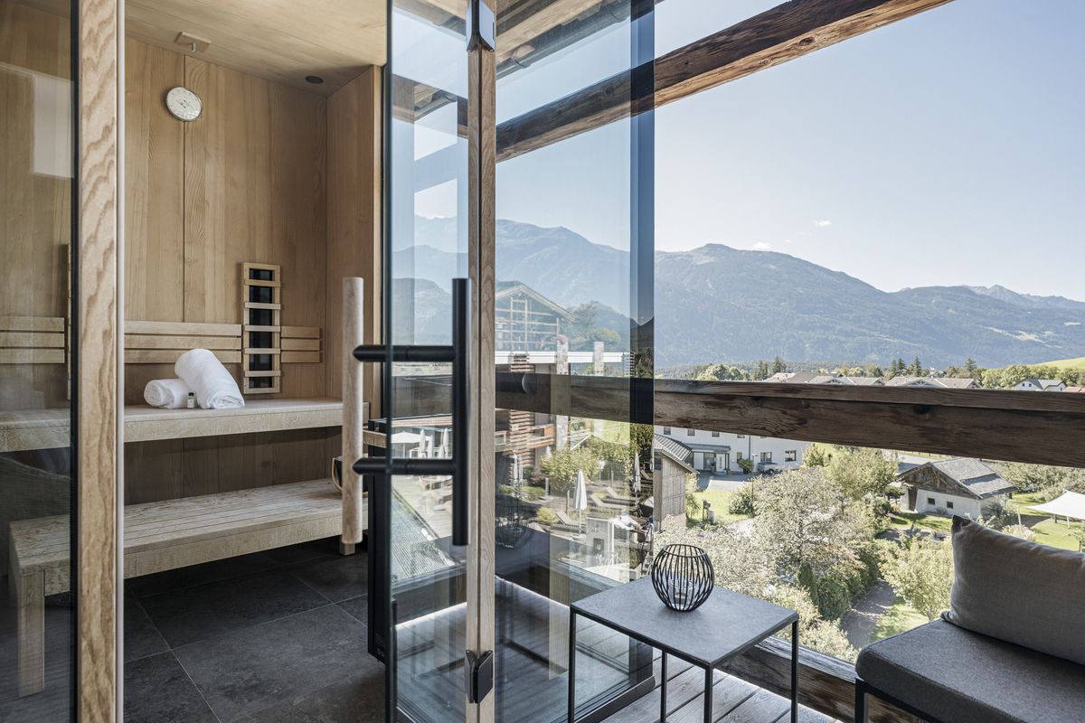 Panorama-Saunakabine mit Infrarot-Therapie.
