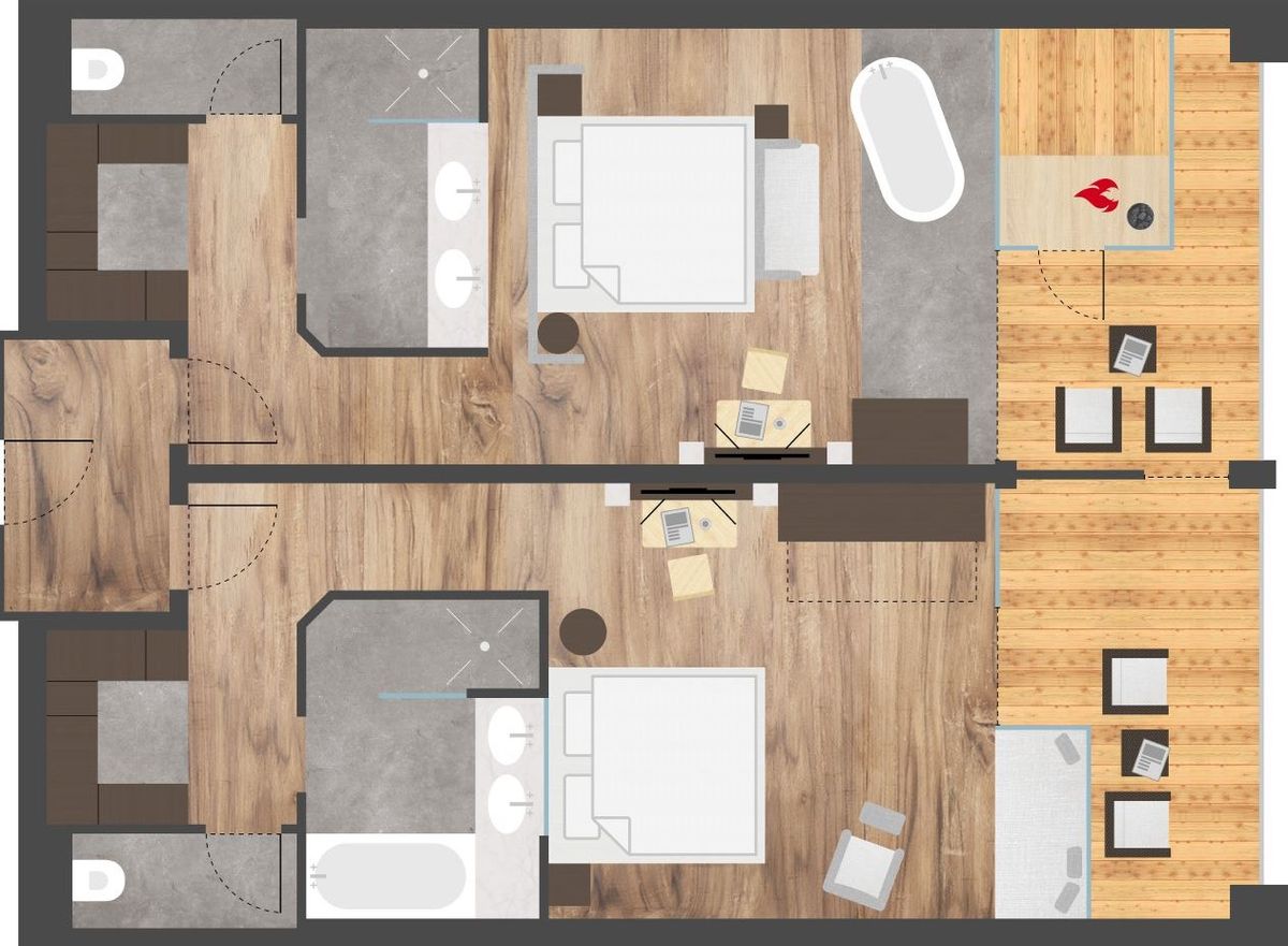 Kombination aus dem Doppelzimmer SPA LOFT und Doppelzimmer FREIRAUM.