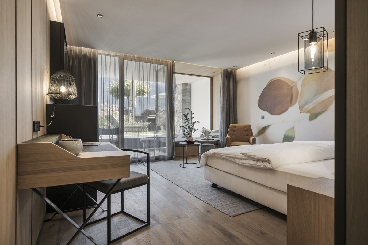 Ca. 45 m², Modern ausgestattetes helles Doppelzimmer, hochwertiger Holzboden, Klimaanlage, großer Balkon oder Terrasse. Kingsize Doppelbett. Freistehende Badewanne, Panorama-Saunakabine. Zum Schlafzimmer hin offenes Bad mit Dusche, Doppel-Waschtisch, WC separat.