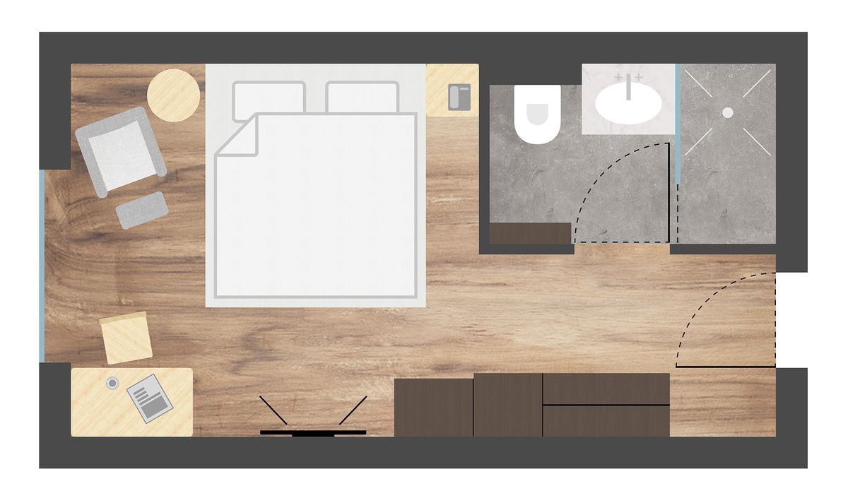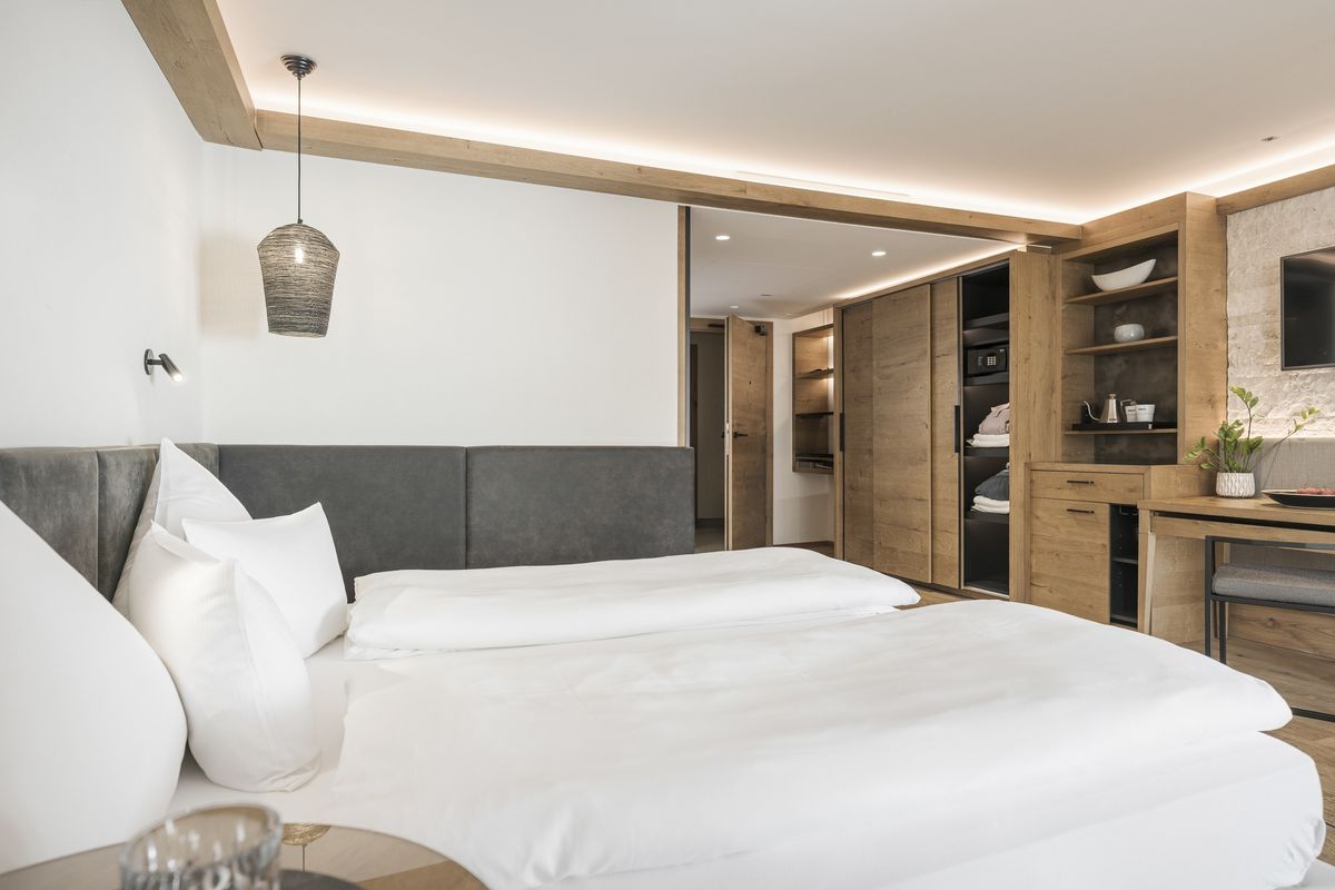 ca. 22 m², Holzboden, kleine Sitzecke, Minibar, TV-Radio, Badezimmer mit Waschtisch, Dusche und WC (ca. 4,5m²)